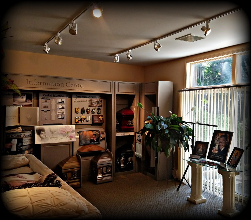 Our reception area is equipped to serve more than one hundred people. The tall ceilings and large bay windows create a wonderful setting to meet and greet your family. There is also a full kitchen area to accommodate all of your food & catering needs. The fireplace in the room has a lovely mantle in which you can display your loved ones photographs. One of the highlights of this area is that there is a separate entrance to the reception area. Also, this room is available for special events or community programs.